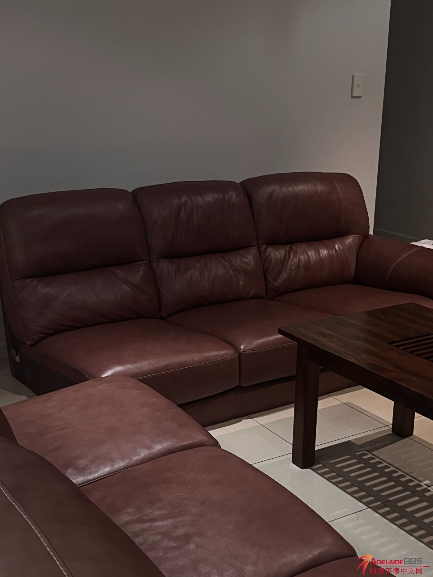 Plush皮质六座组合沙发,非常有质感,很好看! 可以连成一排摆放,也可以和我们一样转角摆放 有沙发腿,配件齐全,我们因为懒得弄,一直没安腿 ...