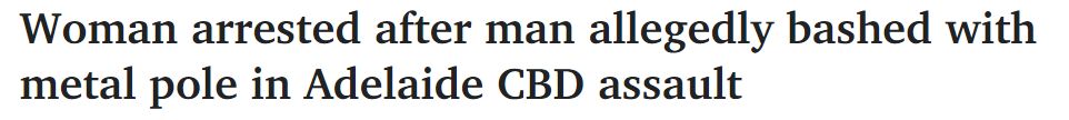 据悉,南澳警方在周三凌晨目睹了一名18岁女子涉嫌用金属杆殴打一名男子。 周三上午,一名男子据称在CBD被人用金属杆殴打,随后一名女子被捕。 该女子看到警察靠近,试图跑出一段距离,随后在Whitmore Squa ...