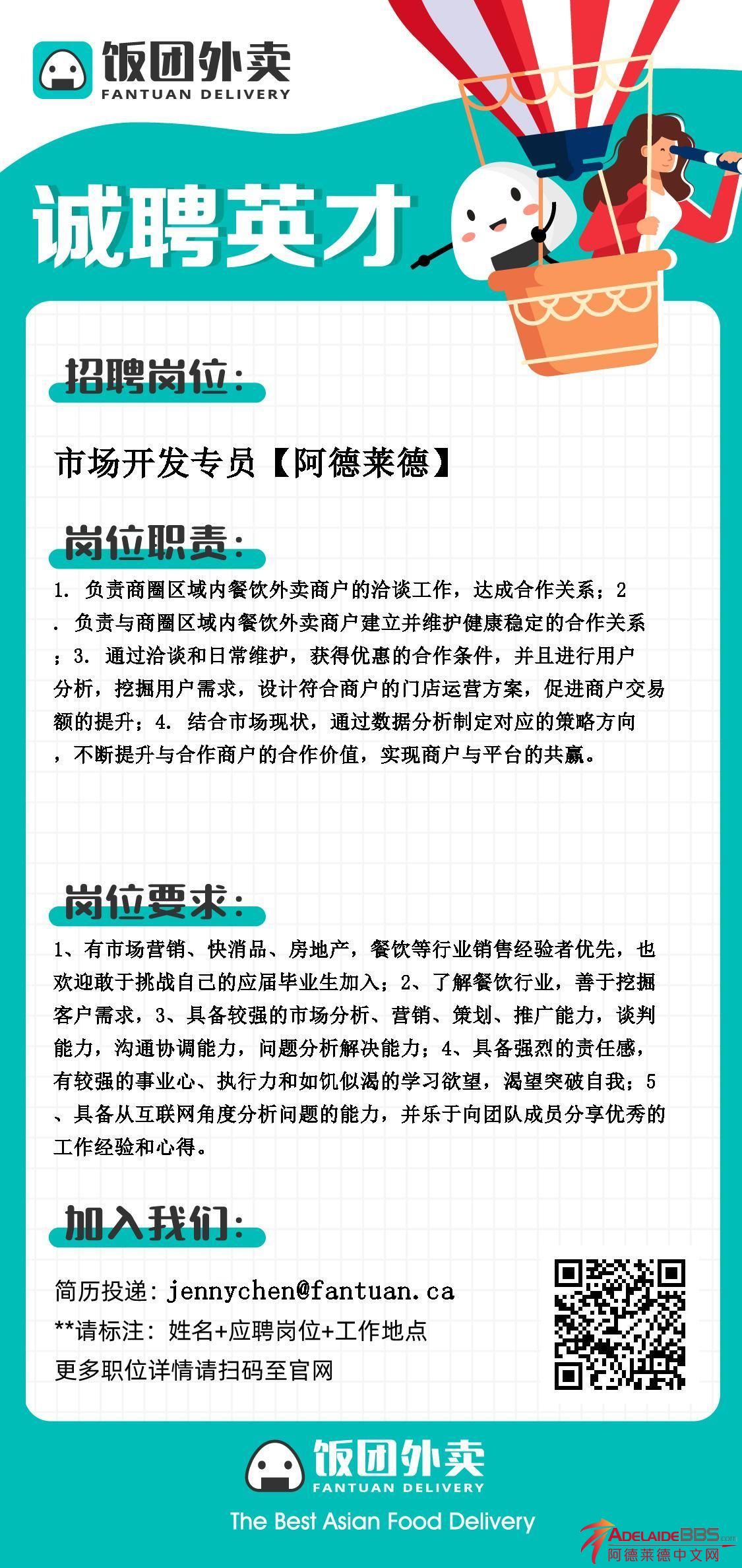 饭团外卖 诚聘英才 招聘岗位: 市场开发专员【阿德莱德】 岗位职责: 1. 负责商圈区域内餐饮外卖商户的洽谈工作,达成合作关系; 2. 负责与商圈区域内餐饮外卖商户建立并维护健康稳定的合作关系; 3.通过 ...
