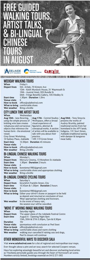 本帖最后由 bonniema1980 于 2011-7-21 13:31 编辑 免费艺术之旅,名额有限,尽快预约吧! 南澳最大的社区视觉艺术节SALA Festival 首次为华人社区开启免费中文导游旅程欢迎个人或团体预约 在充满艺术气氛的八 ...