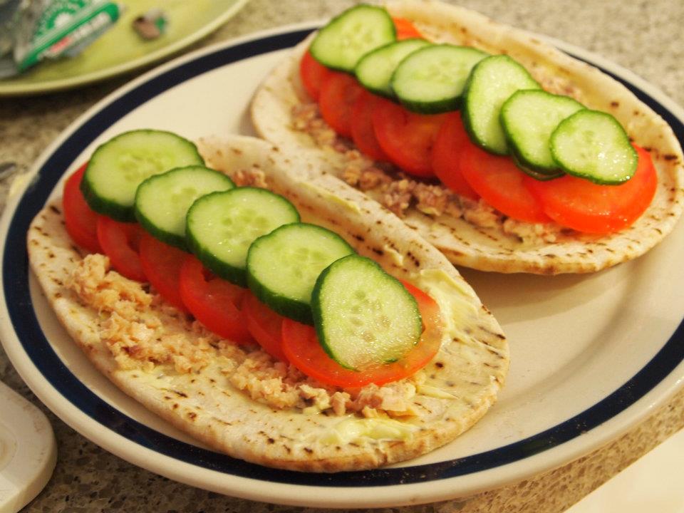 我有吃碳水化合物的啊...但很少啦. 今晚的晚餐.=) 我只吃一个. 材料:pita bread (wholemeal)(更多纤维素),margerine(fat free, non added salt),cucumber, tomato, canned salmon. 甜点:apple+lemon+m ...