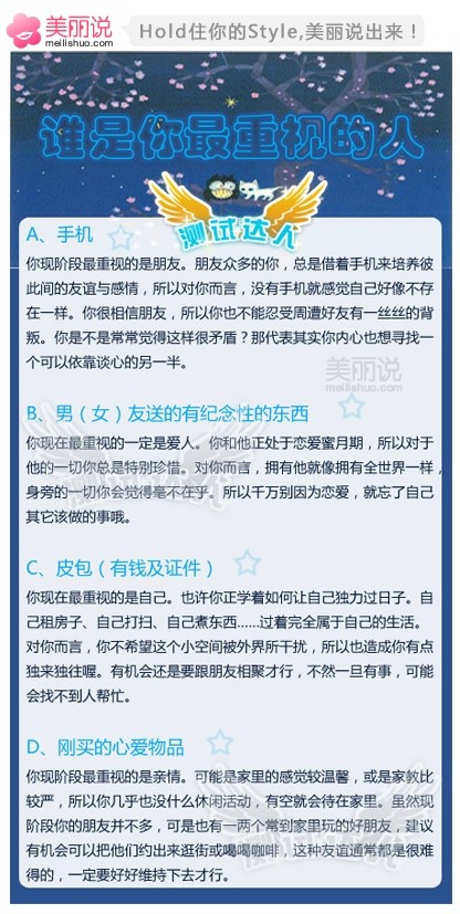 谁是你最重视的人】假设有一天,你骑摩托车经过一个地方,发觉自己有东西掉了,车速过快,你不能及时返回去捡。这时,你最不希望掉的是下面哪一项?【A】手机;【B】男(女)友送的有纪念性的东西;【C】皮包(有钱 ...