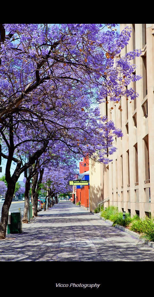 蓝花楹这名字真好听。放狗查了一下,jacaranda 属紫薇科。 我也是偶然在微博上看到有一个帖子说非洲的紫薇开得很漂亮,才想起来那时候和媳妇专门去city逛街拍过这个,然后把片子翻出来修了一下~~~~~~ |