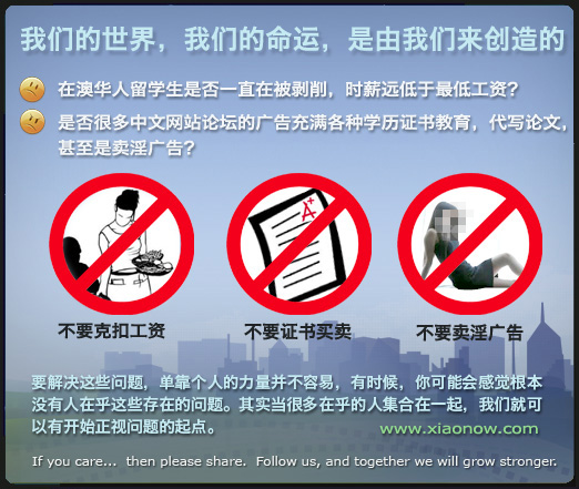 本帖最后由 Aussborn 于 2012-3-15 18:35 编辑 So u reckon this is gna work? By opening some random webpage ppl hv hardly even heard of.. Or by shouting out loud some slogans on a bbs covering a Chinese population of less than 80k? So y do u think chn students always get ripped off? Hv u seen students from western Europe working as prostutes? Hv u seen japanese students working for free js for the sake of getting residency? U might wna go home and re think about the real reason behind this whole thing young man. Be realistic dude. |