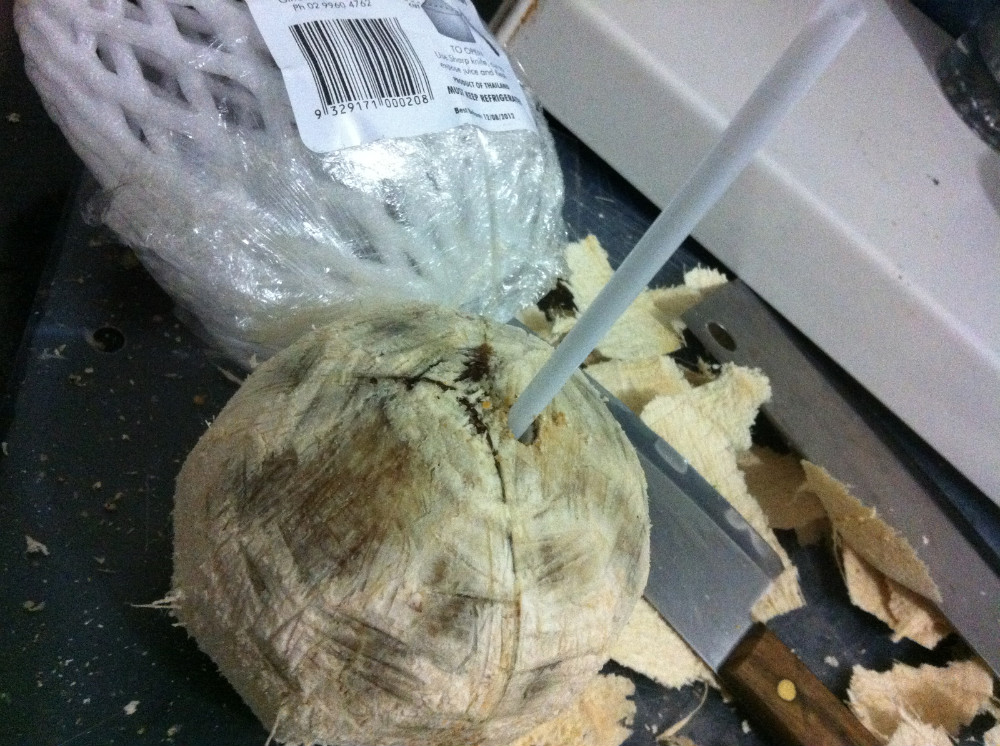 曾经家门口有个椰子树的我告诉你个好办法。 工具:刀一只,螺丝起子一个,锤子一个。 步骤一,用刀在相对的两头切个小小的平面。 步骤二,一个平面用于稳稳的呆着,另一平面朝上。 步骤三,螺丝起子对着上面的平面,锤子稍稍用力一敲,一个孔足够放吸管了。在相邻的地方再敲一个孔,换气用的。 步骤四,喝吧。。。。。 ![]() |