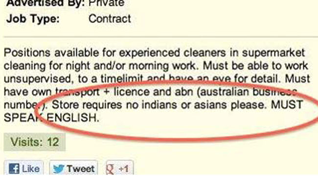 日前,Coles塔州霍巴特市的购物中心门店在网上打出了一份清洁工的招聘广告,而在这份招广告的末尾,赫然有“不要印度人和亚洲人”这么一句颇具种族歧视嫌疑的内容。 这份广告一经曝光,顿时在当地的社交网 ...