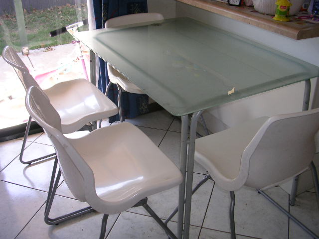 厚身玻璃光面磨砂底餐桌(图片中的桌面白色是反光),陪四张白色餐椅,联系0421176298