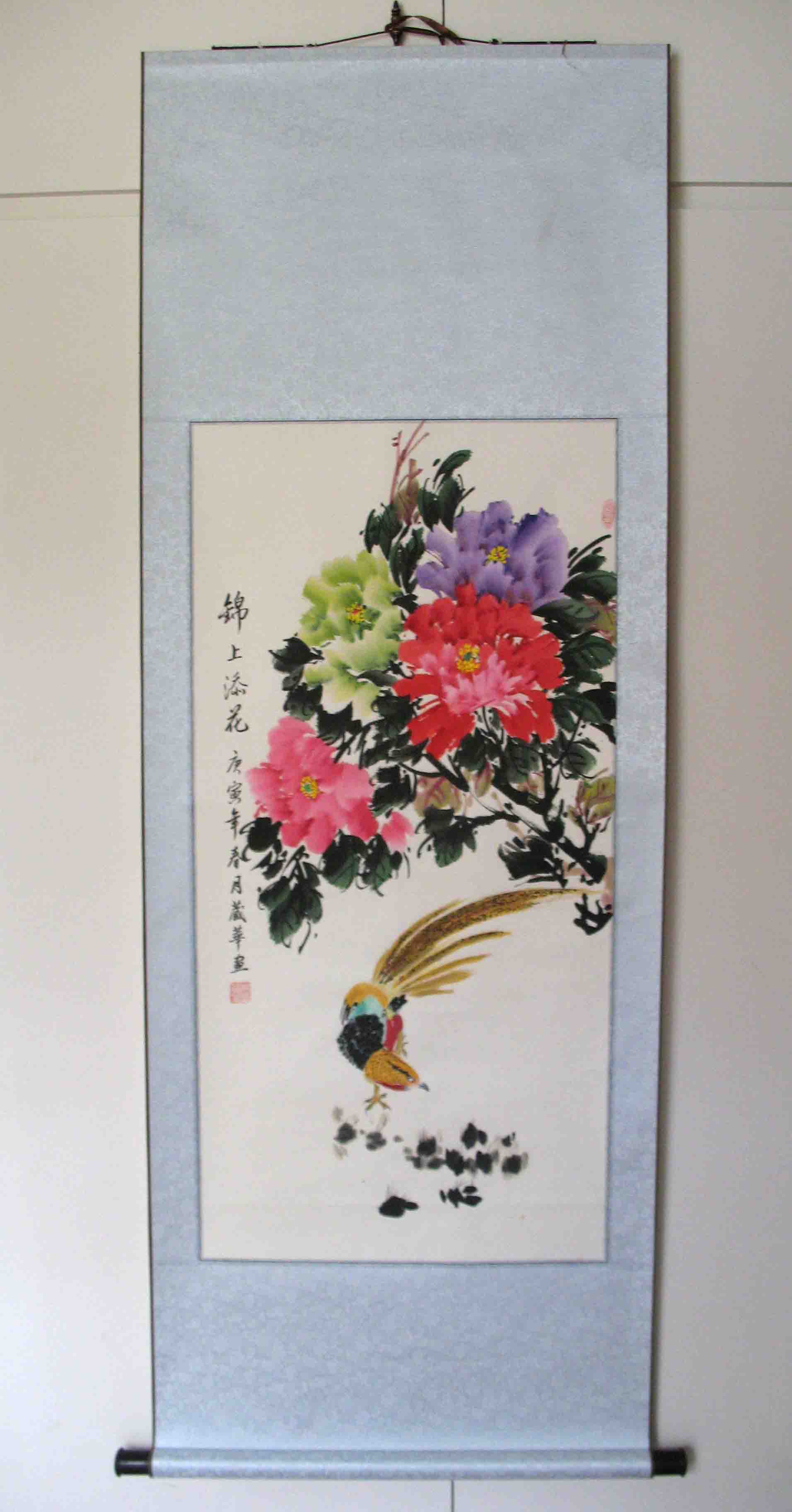 如图,锦上添花国画一幅 ,(纯手绘非喷绘)。 已装裱好,回家挂起来即可。 或者送朋友开店,安居的礼物都非常好。 整体尺寸高大约2米,宽大约1米。中国花鸟山水艺术家 朱藏华(今年已78岁) 亲笔 售价$166
