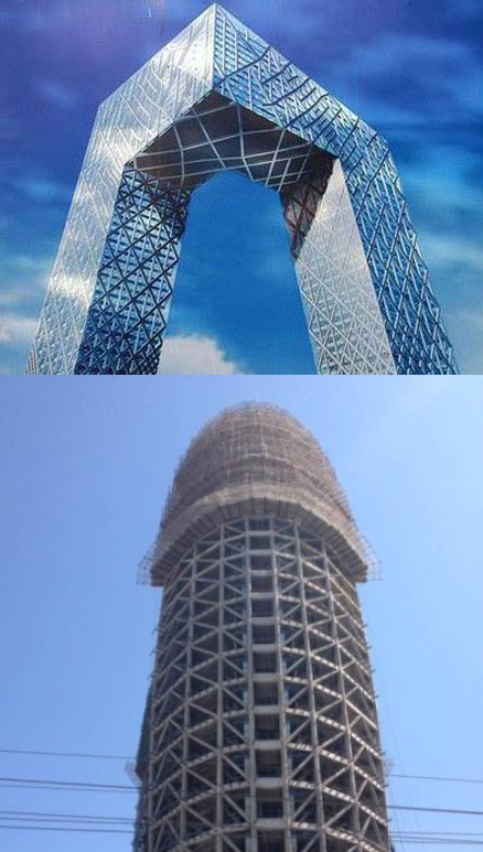 上图就是大家熟知的央视大楼,俗称“大裤衩” 下图是正在兴建中的人民日报社新楼 这尼玛都是谁设计的?太有才了,楼如其名啊。央视这下不寂寞了。