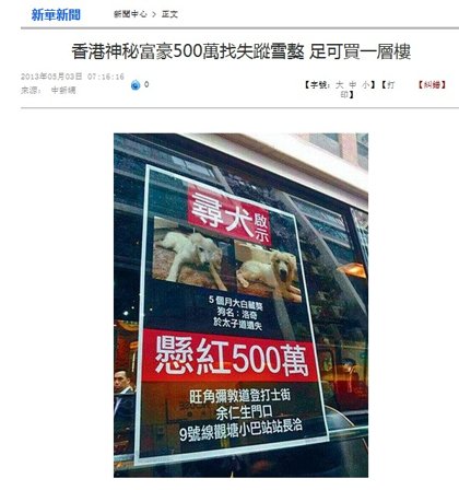 狗狗走失, 悬赏五百万 (有图) 香港《星岛日报》报导,这只全港仅此一只的大白雪獒,品种极罕见,是住九龙塘的狗主人五个月前,斥资一千二百万港币从大陆购得,但却在四月廿五日住家附近溜狗时,挣脱狗炼逃跑。