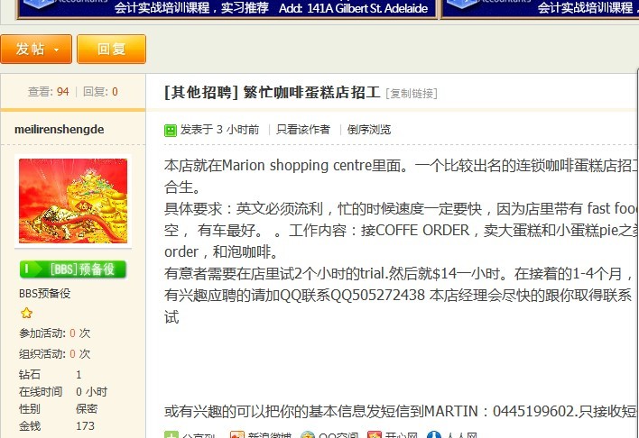 在招工区“有繁忙蛋糕店招工”的贴,联系方式是假的,大家小心。