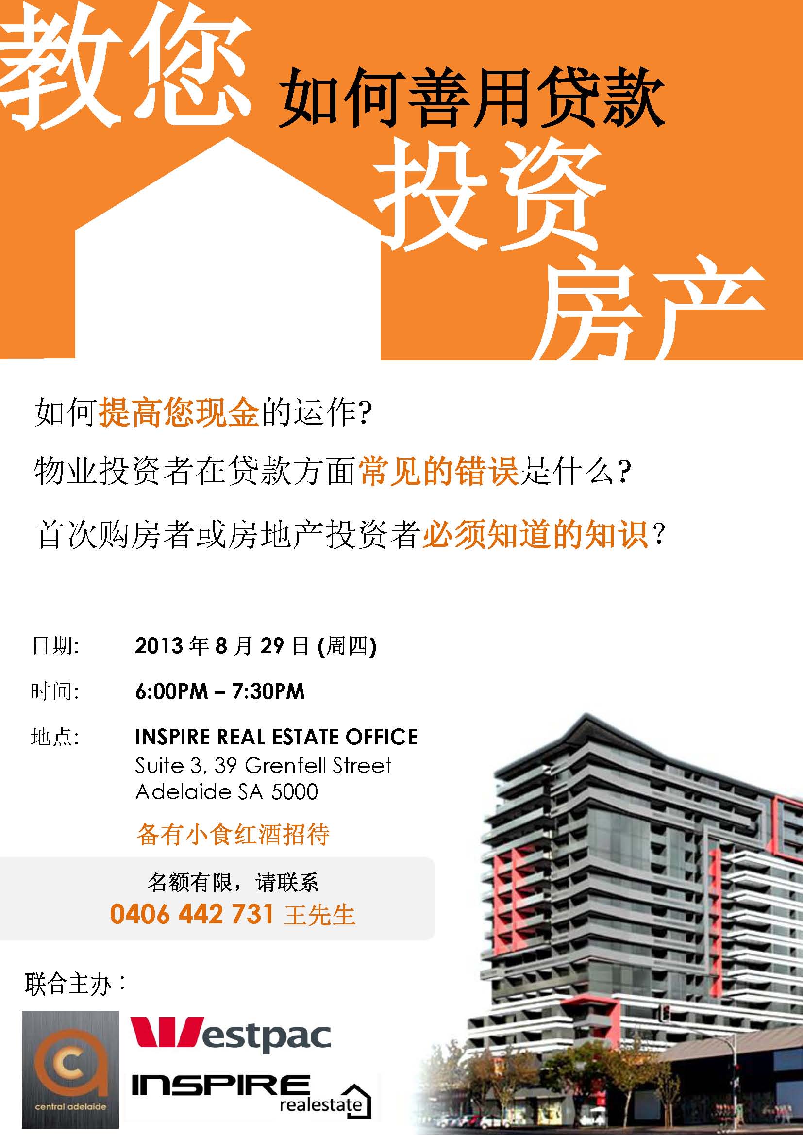 本帖最后由 Inspire房地产 于 2013-8-27 08:48 编辑 由启泰房地产(Inspire Realestate) 盛世康城和Westpac 银行联合举办 名额有限,请马上电话联系 John Ong 王先生 0406 442 731 ~~~~~~~~~~~~~~ ...