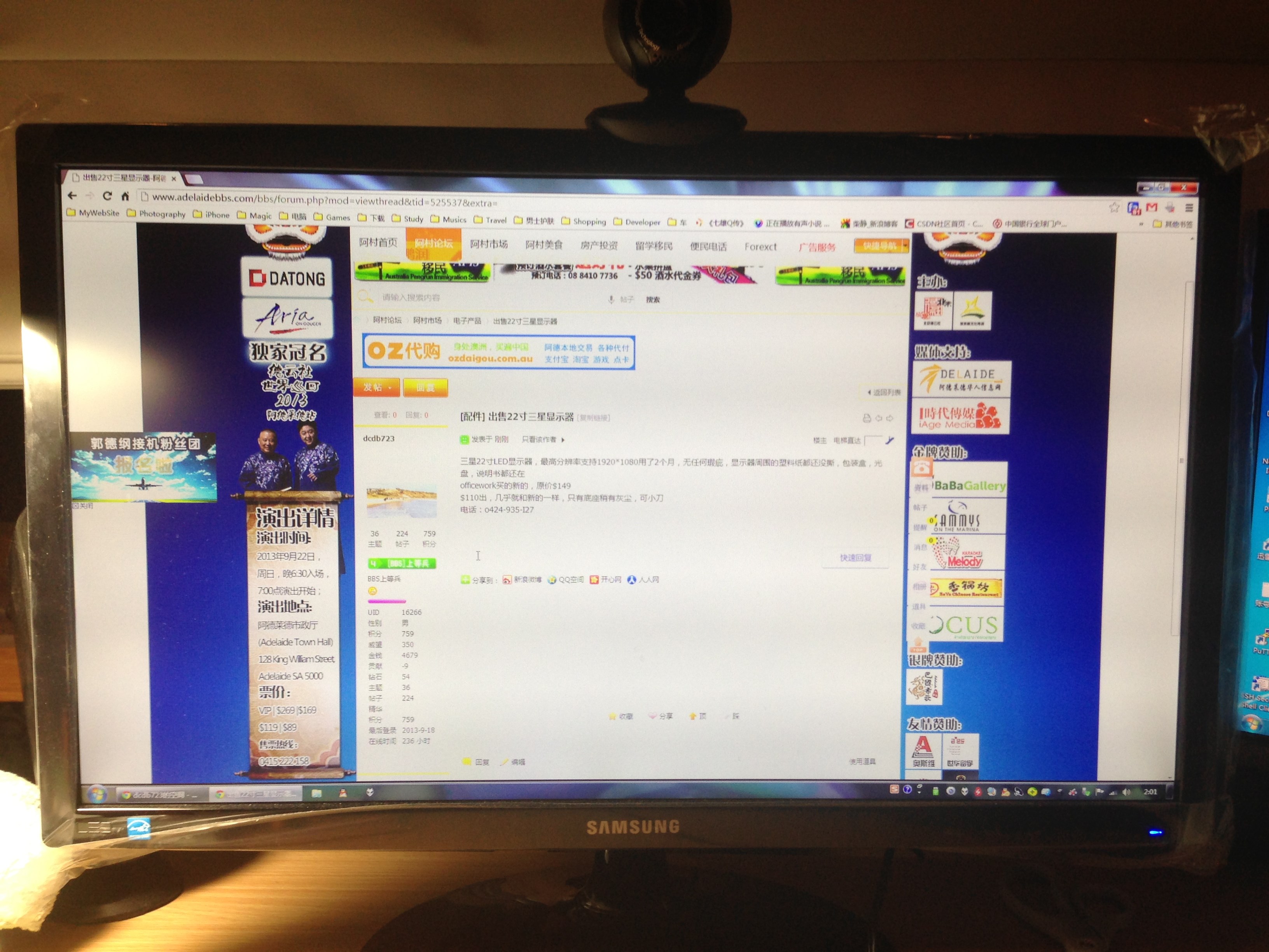 本帖最后由 dcdb723 于 2013-9-18 02:12 编辑 三星22寸LED显示器,最高分辨率支持1920*1080用了2个月,无任何瑕疵,显示器周围的塑料纸都还没撕,包装盒,光盘,说明书都还在 officework买的新的,原价$149 $11 ...