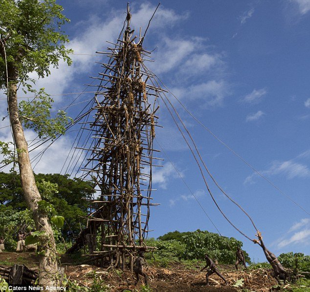 据《每日邮报》2014年7月9日报道(具体拍摄时间不详),瓦努阿图五旬节岛,男子用藤条拴在脚上,从90英尺高的木架上跳下,上身要着地,没有任何保护,下面只是一些挖松的土,据了解在当地象征成年男子的勇敢。( ...