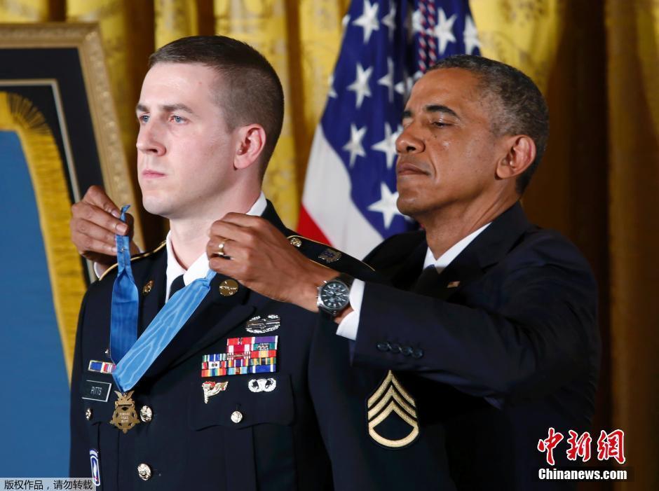 2014年7月21日,美国华盛顿,美国总统奥巴马授予美国陆军前中士Ryan Pitts荣誉勋章