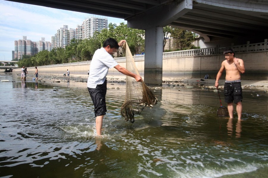 2014年7月22日,近日因北京护城河上游换水,致北京市广渠门附近河道内的水位下降见底,市民争相下河捞鱼。记者观察在两公里范围的河滩内,有接近40位捕鱼人在争相拿着渔网、抄子下河捞鱼,还互相交流着心得。据 ...