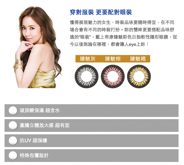 台灣製造 帝康TICON 隱形眼鏡由台灣知名藝人侯佩岑代言A.軟性雙週拋 $22/ 6 pcs B.彩瞳日拋 $16/ 10 pcs 共5色:褐金、紫紅、豔灰、水藍、翠綠 C.軟性日拋 $18/ 16 pcs(20/11新增許多款式)帝康眼鏡為台灣知名品 ...