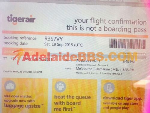时间看错了,现在转让两张虎航10月26日18:45-20:35阿德莱德-墨尔本机票。50元/张。有兴趣又刚好能用的联系吧。微信109072443
