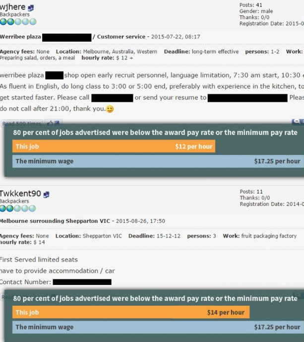 一些中文招聘广告中甚至直言不讳地承认他们提供的岗位是“黑工”(非法工作)。员工工资被剥削的情况并不仅限于特定行业,在许多低技能或半熟练工种中尤为常见。在某些极端的案例中,还有工人时薪低至4澳元。隐藏在暗处的中介网络还会向那些潜在的外国求职者收取额外费用来帮他们找工作。一位不愿透露姓名的求职者称,自己曾收到中介的死亡威胁。