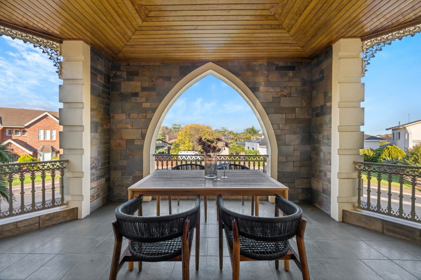 这座恢弘的两层住宅坐落于Jordan Reserve旁一条静谧成熟的老街,位置得天独厚,将永恒优雅与家庭实用完美融合。经过景观设计的花园与醒目的石材立面勾勒出建筑轮廓,其卓然的建筑气势与精妙的细节处理令人过目难忘。 弧形车道与庄严门厅从入门伊始便奠定尊崇基调。步入铺砌瓷砖的挑高门廊,实木打造的弧形楼梯与垂悬的水晶吊灯相映成辉,贯穿全宅的典雅格调由此展开。 首层多元的起居空间满足各类场合需求:装饰立柱与天花线脚装点着正式客厅与餐厅,而独立的娱乐室则以木质天花与特色壁炉营造温馨氛围。中央厨房配备大量实木橱柜与宽敞操作台,毗邻开阔用餐区。双车库后方更设有第二间全功能厨房,为宴客或大家庭生活提供灵活选择。 全宅五间宽敞卧室中,四间位于上层,首层卧室临近全套卫浴,特别适合宾客或多代同住需求。上层主卧套房堪称私密圣殿,内置步入式衣帽间,配备大理石台面双人盥洗池与按摩浴缸的豪华套卫尽显尊荣。其余卧室均设嵌入式衣柜与学习角,其中两间更可通往后向阳台。经由上层平台可达前向景观阳台,将住宅的恢弘气度再度延展。
