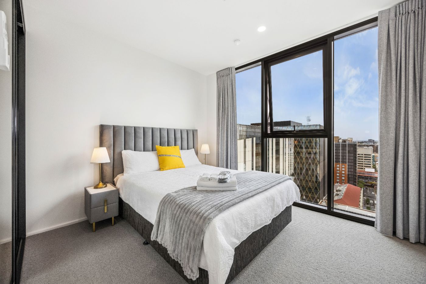 • 两间宽敞卧室均配备大床、入墙衣柜及落地玻璃窗,可欣赏壮丽城市景观。
