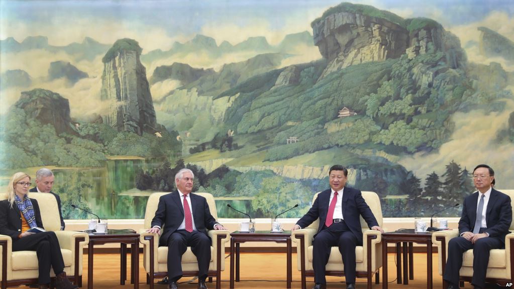 中国主席习近平和美国国务卿蒂勒森在北京人民大会堂会晤(2017年3月19日)。左起第一人为美国国务卿办公室主任玛格丽特.彼得林,右起第一人为中国国务委员杨洁篪。 美国国务卿蒂勒森在访华期间与中国 ...