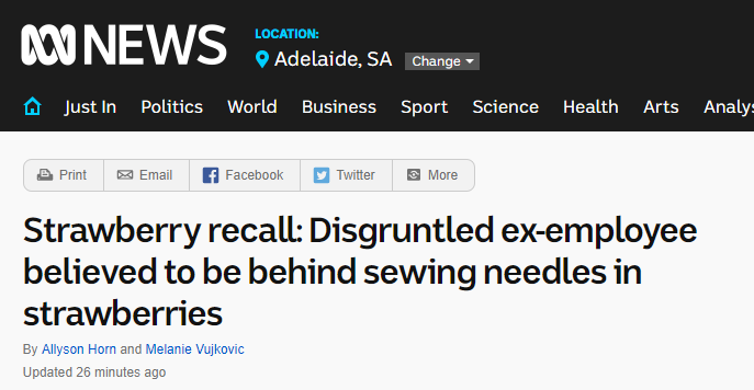 最新进展! 含针草莓真凶或已锁定! 昆士兰又有两名孩子吃到带针草莓! 截至目前吃到带针草莓事件已有4起! 再次提醒!家有这两种牌子的草莓赶紧扔掉或者拿去超市退钱! 另外,警方认为他们 ...