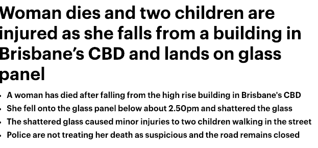 太可怕! 布里斯班CBD一女子从一建筑物上落下! 该女子当场死亡,另有两名孩子受伤! 但不幸的是,该女子伤势过重,当场死亡! 根据警方的调查,该女子的死因未被定为可疑, 并提醒民众,如果需 ...