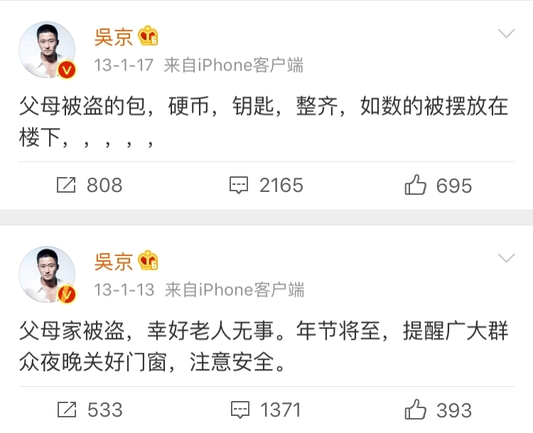 最近流浪地球票房高涨,吴京的关注度再次被推上热搜,甚至有网友扒出了他13年的传奇微博,说吴京家以前被盗了,吴京发了微博说自己家虽然被盗,但是老人无事,还提醒大家年节注意安全,注意防盗。