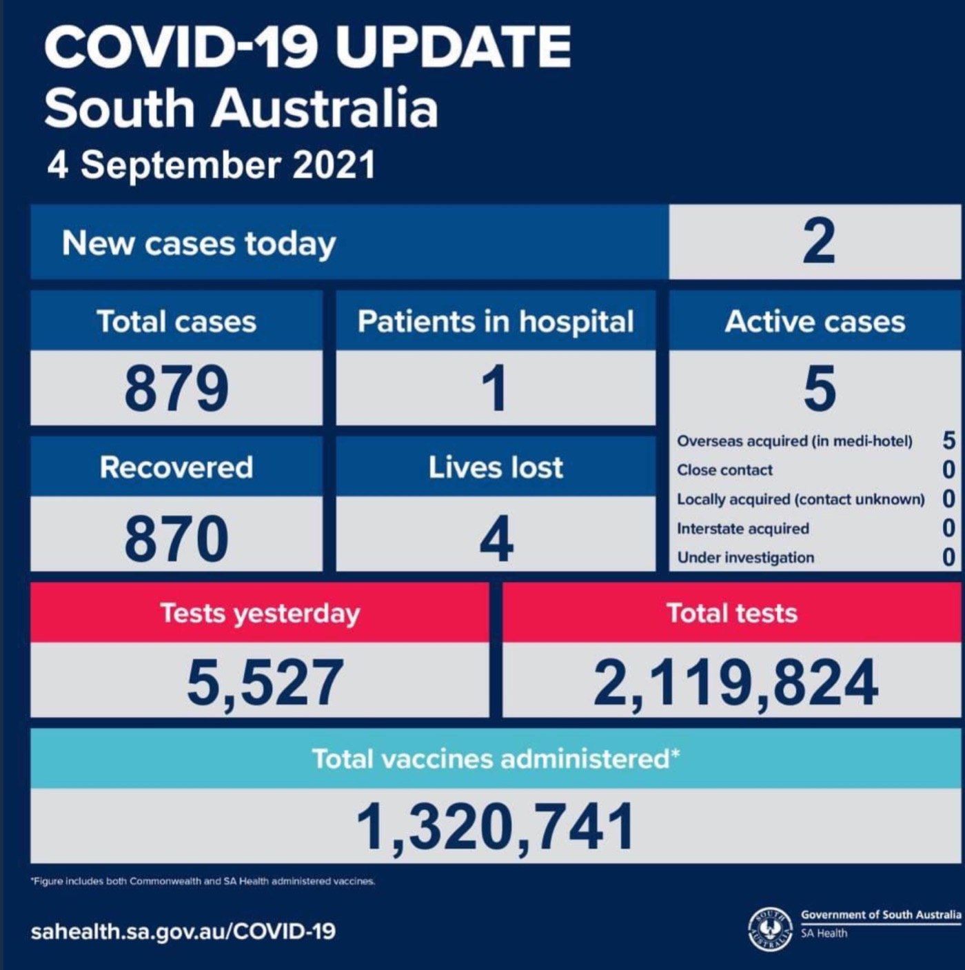 2021年9月4日,星期六,南澳新冠病例情况更新如下: 新增确诊病例2例!均为海外输入病例 活跃病例5例,1患者在医院中康复与治疗。 康复870例,死亡4例。 昨日共进行检测5527次,累计检测2119824次 图文来 ...
