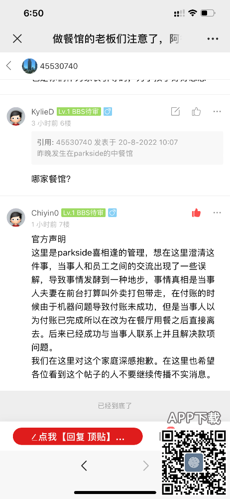 45530740 发表于 22-8-2022 23:23 确实里外不是人呢! 既然不了解事情全过程就打抱不平?我周围都没客人坐,您是哪一桌?哪里听到我催菜了?又是哪里看到我们一个一个溜走?戴个帽子就是鬼鬼祟祟?餐厅收银小姐姐是有不足的地方,她今天道歉了。您写的小作文和评论人渣、可怜孩子什么的,难道不过分? 既然老板娘说你不是餐厅员工,那就不是吧。 谢谢你发的帖子,不然我还不知道刷卡被decline,下次再去帮衬的时候被人骂还不知道是为什么呢。 |