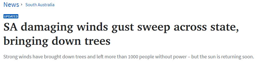 南澳狂风持续肆虐,数千户停电! 南澳经历了一夜强风,大风吹倒了树木,导致数千户停电,预计周五将有更多的破坏性大风来袭。 东南海岸上游和东南海岸下游已发布大风警报,阿德莱德、中央海岸、中南海 ...