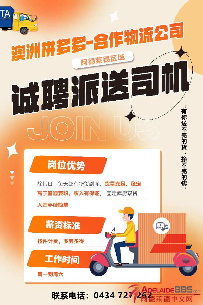 澳洲阿德区域诚招快递员(请大家擦亮眼睛,这是招聘原帖,不要被盗版的帖子骗了) 工作流程: 每日从当地库房取货,确保包裹按时送达客户指定派送地点,当日工作完成,无需再折返库房 岗位优势: 1.   ...