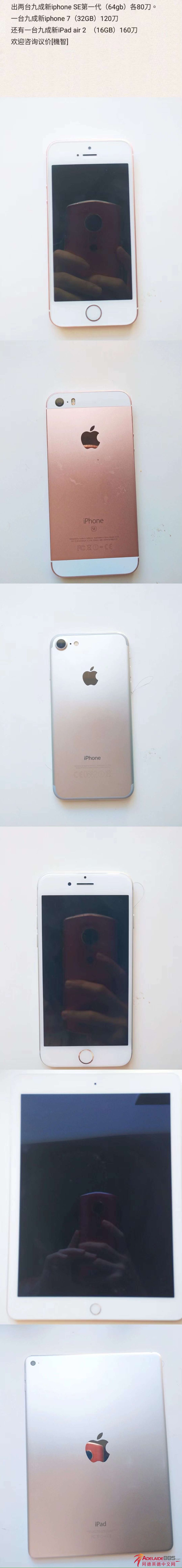 卖一台二手九成新IPHONE SE (64)GB 80刀。一台二手九成新Iphone7 (32GB) 130刀 和一台二手九成新的IPAD AIR 2 (16GB)160 刀。 欢迎微信联系我,可微议价! 微信:a87672726