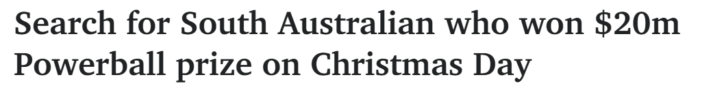 据报道,一位南澳人在圣诞日赢得彩票大奖,已坐拥2000万澳元财富。这张彩票在上周四的全国Powerball抽奖中赢得一等奖,但持票人至今尚未认领奖金。 中奖彩票购于Noarlunga Centre的Colonnades Lotto Kiosk。由于持 ...