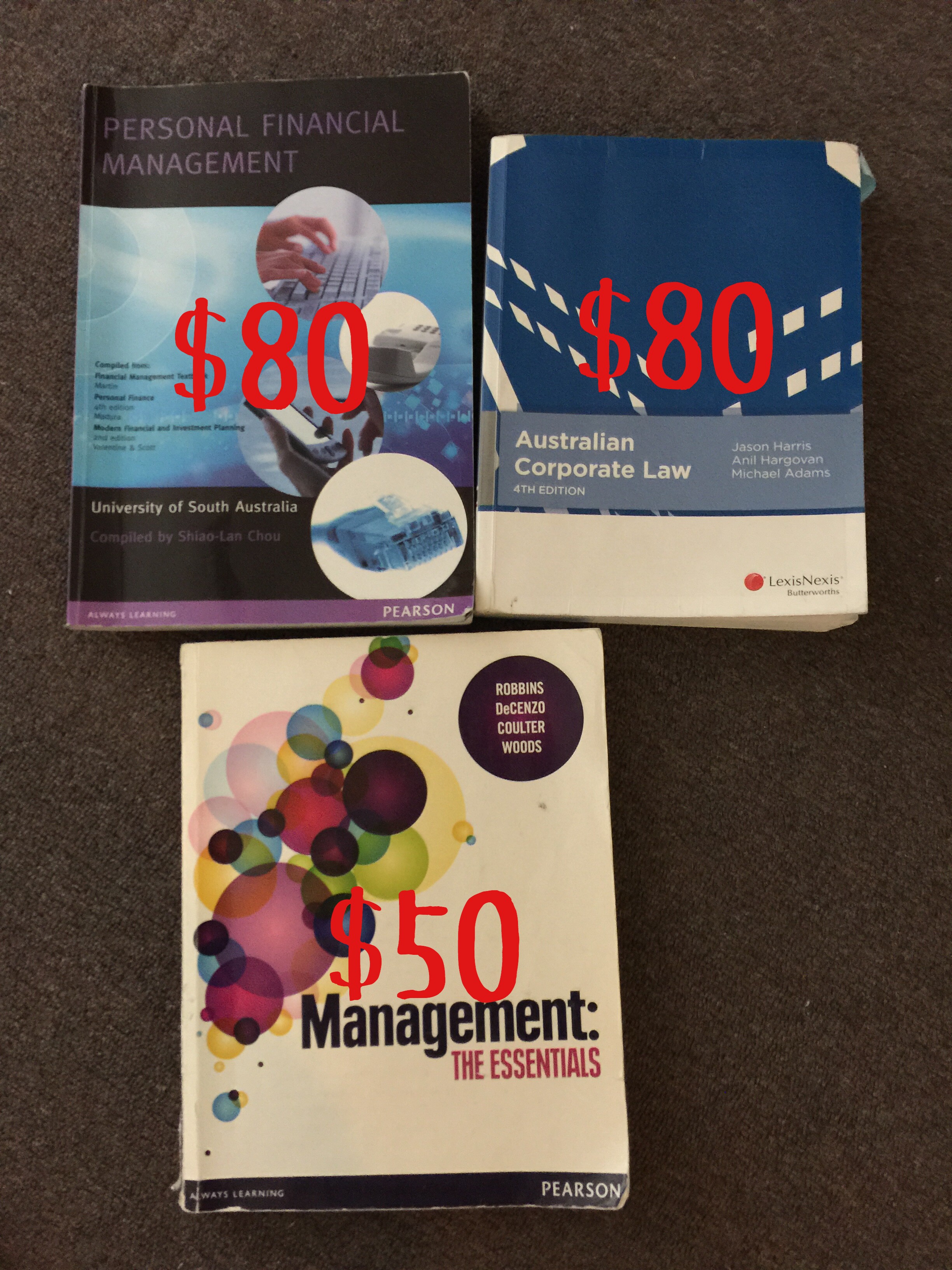 Personal financial management 几乎是新书,70刀 corporate law 4th edition 70刀 management principle 30刀 mobile: 0478 968 966